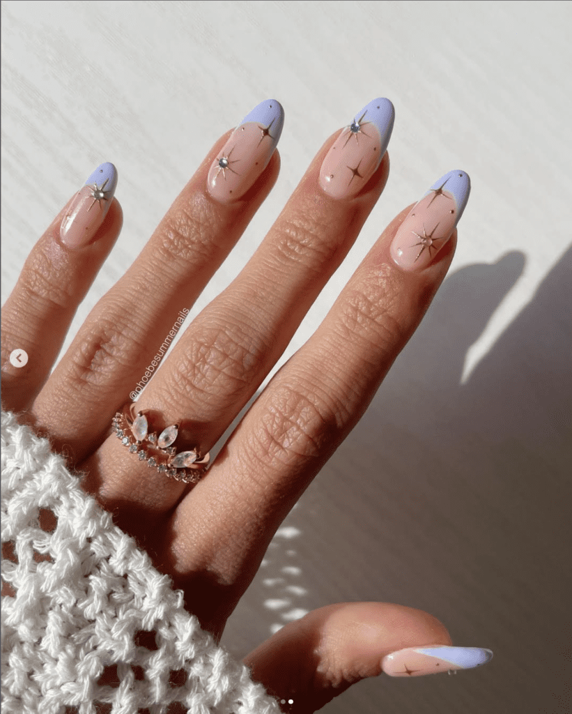 These lilac French tips are such a dreamy take on a spring almond manicure. The sheer pink base keeps things minimal, while the tiny gold star accents add just enough sparkle to catch the light. It’s delicate, slightly celestial, and perfect if you want soft pastel nails with a little personality.