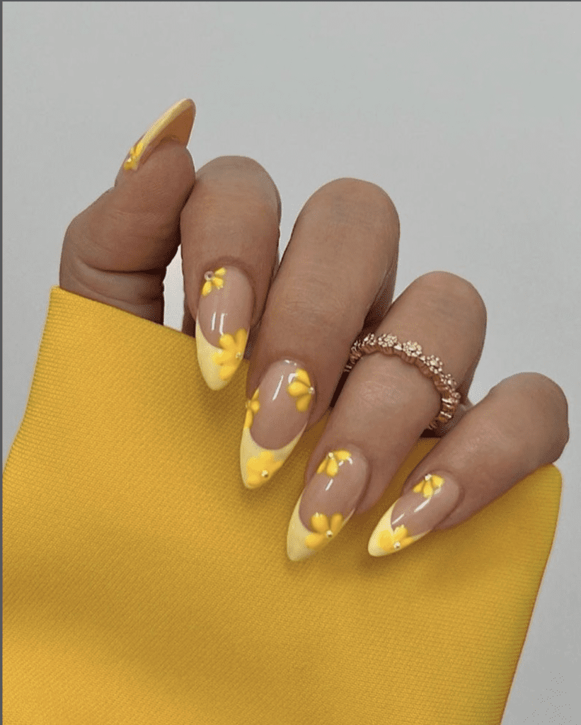 24. Yellow Floral French Tip Almond Nails