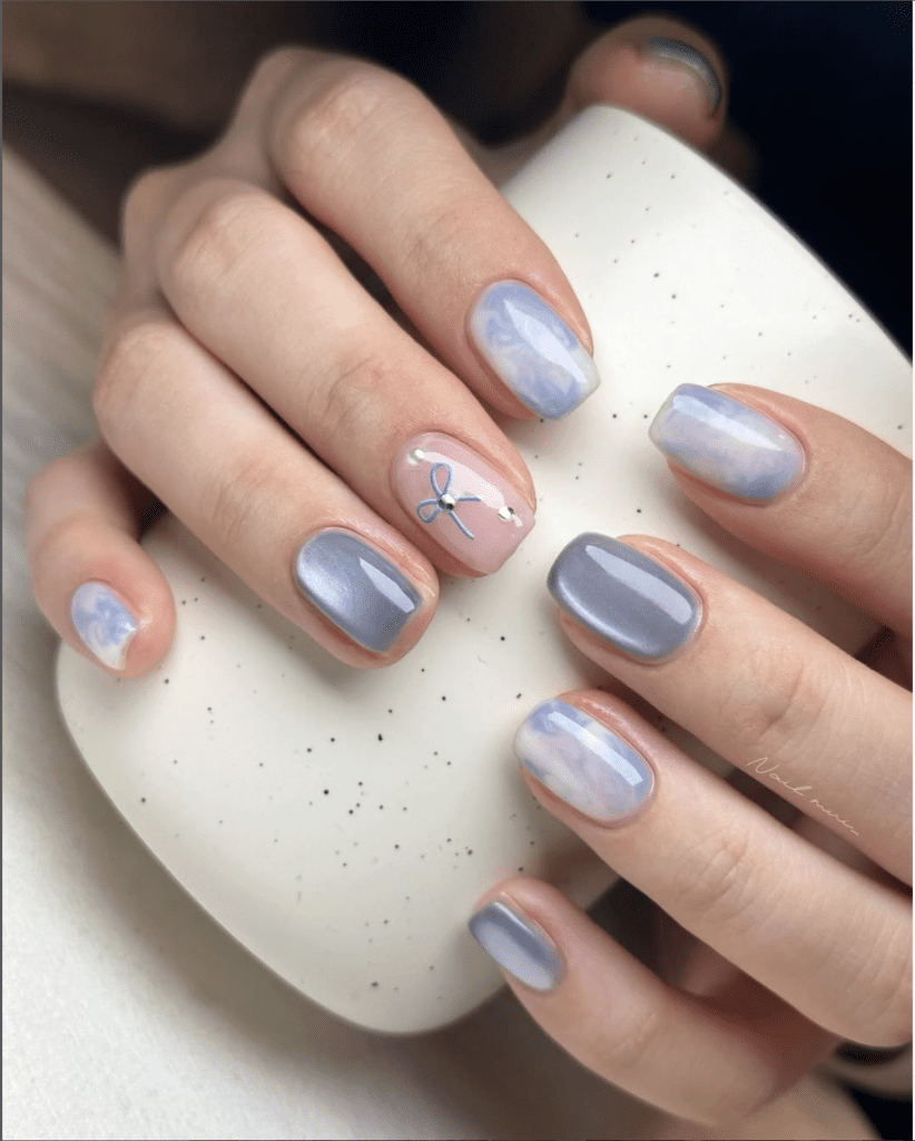 These square spring nails mix soft blue marble accents with glossy chrome details for a modern, elevated look. The muted periwinkle tones feel cool and seasonal, while the subtle shimmer adds dimension without going overboard. I love this for anyone wanting trendy spring nails that still feel clean and wearable.
