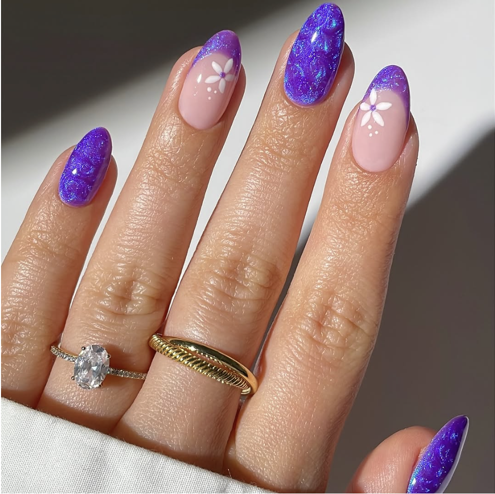 If you’re into shimmer but still want something elegant, this iridescent lavender chrome set is stunning. The multidimensional glow shifts between purple, pink, and blue tones, giving that glazed spring nail effect without feeling heavy. It’s such a beautiful option for a spring event, vacation, or just when you want your nails to feel extra special.