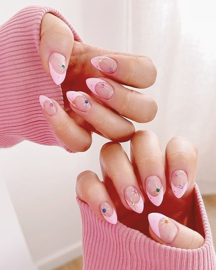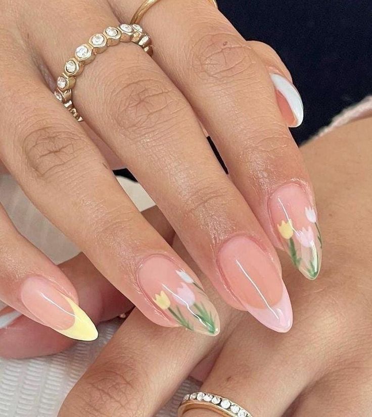 Mixing different pastel French tips across almond nails creates a playful but balanced look. It’s a chic twist on the classic French and one of my favorite March nails ideas for almond shape.