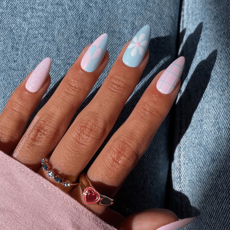 20. Soft Pastel Almond March Nails with Floral & Plaid Accents