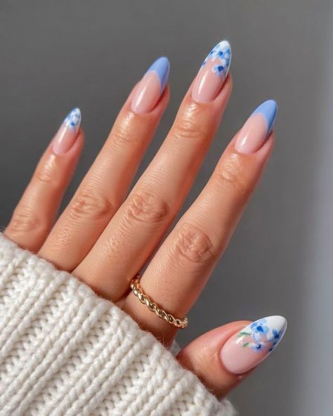 A soft blue French tip on almond nails feels fresh but still elegant. The nude base keeps it wearable, while the pastel edge gives that seasonal pop. It’s subtle but still statement-worthy.